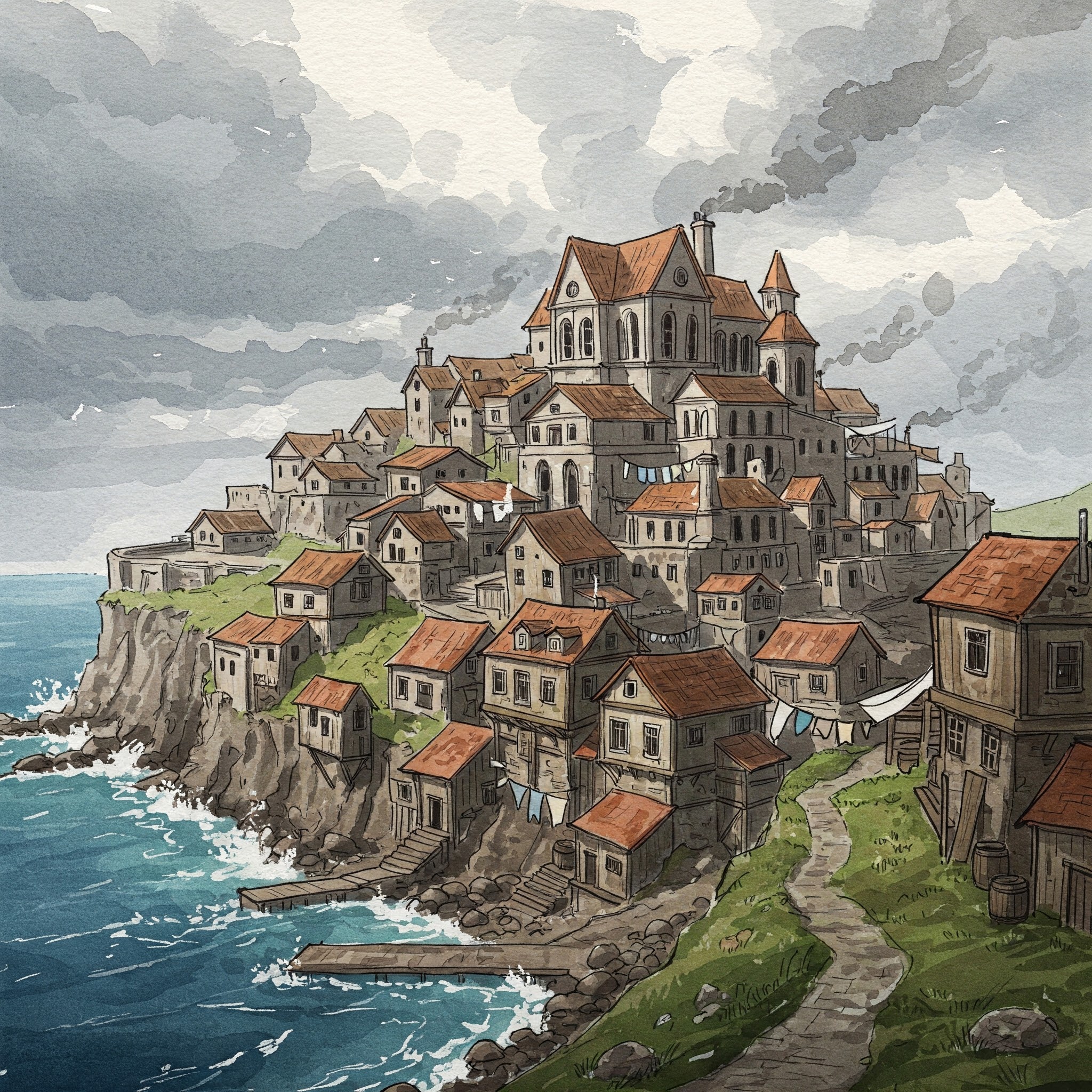 Rimerock is a sprawling coastal port city carved into the cliffs, battered by wind and rain. The city is a chaotic blend of wealth and hardship—at its core, opulent merchant houses, well-guarded estates, and bustling trade districts make up the upper echelons of society.